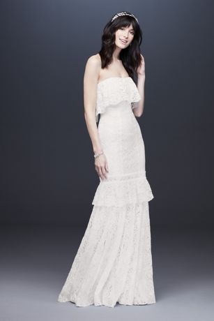 An effortlessly elegant look for the free-spirited bride, this fitted strapless sheath wedding dress is finished with flounce ruffle details on the bodice and sheer hemline to show off your fabulous footwear.