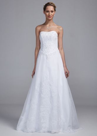 - Strapless Organza A-line gown features stunning lace appliques on bodice and skirt.