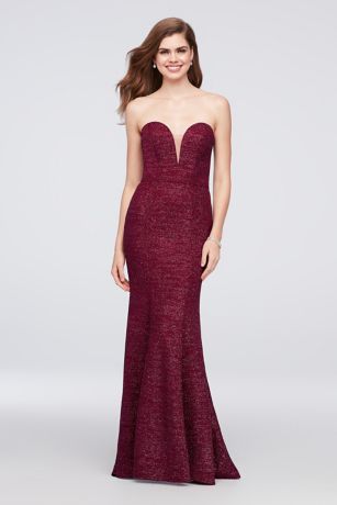 Infused with glitter and finished with an illusion-inset plunging sweetheart neckline, this curve-hugging mermaid dress makes a sparkling statement.