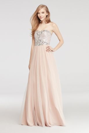 Win best dressed at this year's Prom in this event-ready prom dress! A sequin beaded basque waist bodice flows into a captivating mesh skirt, creating an unforgettable look!