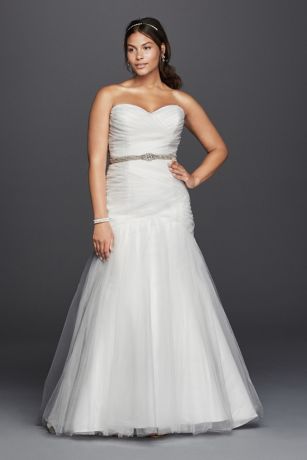 From the sweetheart neckline to the ethereal tulle skirt, this strapless mermaid wedding dress is as lovely as can be. Ruching from the bodice through the hips and a lace-up back create a figure-flattering effect.