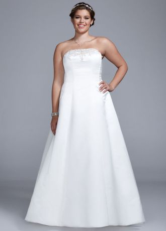 Strapless satin A-line gown with beaded lace detail. Chapel train.