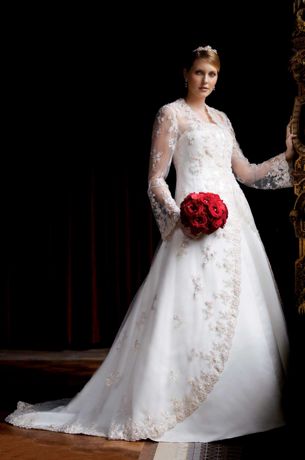 Strapless satin A-line gown with beaded lace details and long sleeve lace jacket.