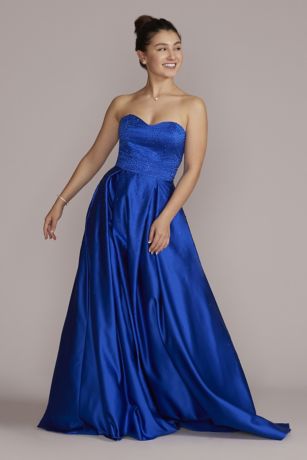 There's a reason why classic silhouettes are deemed as such, and this strapless A-line is no exception. Perfect for prom and almost any special occasion, the silhouette highlights your shape with a fitted bodice and full skirt, while satin fabric shines beautifully.
