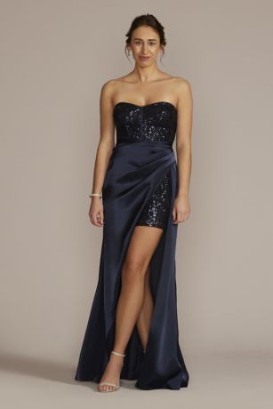 The drama's in the details when it comes to this stunner. A corset-inspired strapless mini dress featuring sparkling sequins stands out even under a luxe satin overskirt.