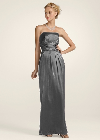 - Strapless, empire bodice features subtle pleating detail and ruched waist to flatter any figure.