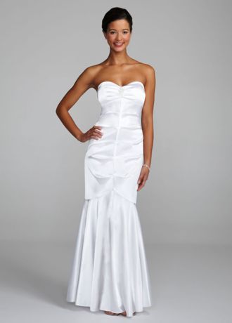 - Strapless stretch satin gown features stunning fit to flare skirt.