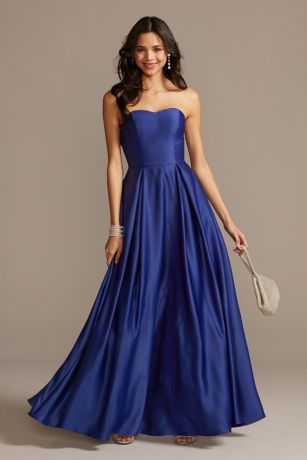 Crafted from high-shine satin, this traditional strapless ball gown gets a revamp with chic side pockets, perfect for stashing your cell phone while you're on the dance floor.