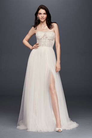 This gown is perfect for the bride who doesn't want to choose between traditional romance and alluring details. Its bustier-style illusion bodice is crafted of beaded sequined lace, while the side-slit, A-line tulle skirt reveals a bit of leg.