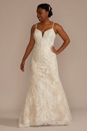 Overall, this strappy allover beaded lace sheath wedding dress from David's Bridal is a true masterpiece. It combines modern design elements with timeless elegance, creating a dress that is both stylish and sophisticated. Every bride deserves to feel like a princess on her wedding day, and this dress will surely make that dream a reality.