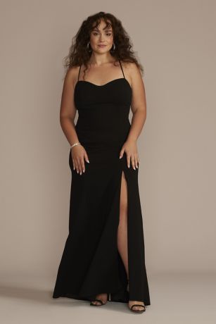 There's nothing basic about this classic sheath. A modern sweetheart neckline and skirt slit make for a memorable entrance, while sexy backside ruching and a dramatic strappy back ensure an unforgettable exit.