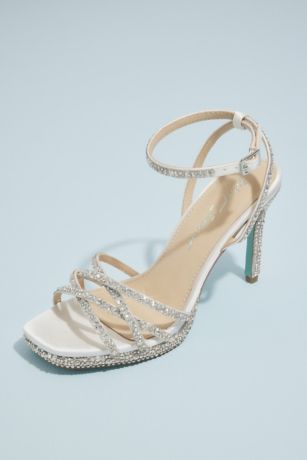 A show-stopping bridal or special event heel, covered in dazzling crystals from the slim ankle wrap to the crisscrossing toe straps.