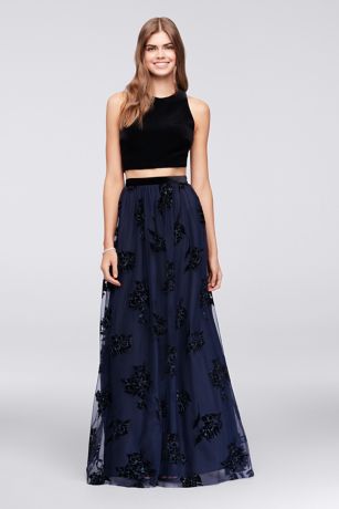 This two-piece dress is both fancy and cool, featuring a trendy velvet crop top with strappy sides and a long tulle skirt with flocked floral velvet appliques.