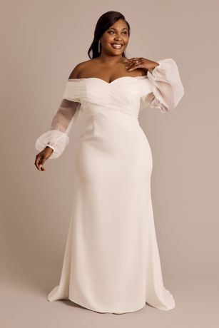 This stretch crepe wedding dress features romantic billow sleeves that add a touch of softness to sheath silhouette. Designed to move with you, the elegant off-the-shoulder fit highlights your figure with timeless sophistication.
