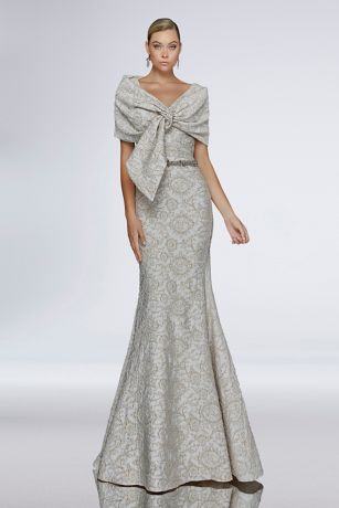 A removable wrap dramatically ties at the bodice of this simple, stretch-jacquard tank gown. Beading at the waist completes the look.