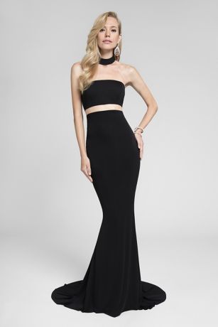 Ready to go fashion-forward for prom? This minimalist stretch-jersey design features illusion insets that give the look of a choker, crop top, and skirt, with the ease of a one-piece dress. The exposed-zip racerback lends a bit of edge, while the sleek mermaid skirt ends in a pooling train.