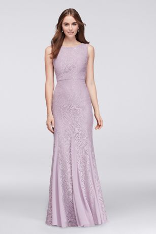 Imagine your 'maids leading you down the aisle in this lovely dress: Soft mesh godet insets give the fitted stretch lace tank silhouette a bit of graceful swish with each step.