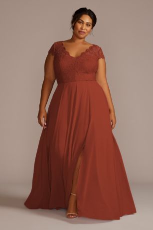 A scalloped V-neckline and cap sleeves take this stretch lace and chiffon bridesmaid dress to the next level. Features side pockets and a skirt slit.