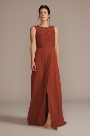 A high neck sleeveless bodice with scalloping sets this stretch lace and chiffon bridesmaid dress apart. Features side pockets and a skirt slit.