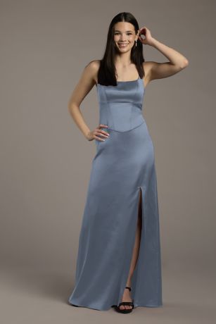 This stretch satin sheath dress features a flattering basque waist that cinches the figure and enhances the sleek silhouette. Its luxurious fabric offers comfort and elegance, perfect for bridesmaids or any special event.