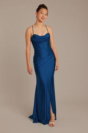 With its combination of a cowl neckline, corset bodice, and stretch satin fabric, this sheath dress is the epitome of elegance and sophistication. Embrace your inner bombshell and make a statement at your next event with this breathtaking dress from David's Bridal.