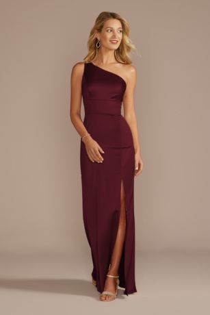 Make your bridesmaids feel glamorous in this sleek one-shoulder satin dress with a skirt slit. The stretch fabric adds comfort to the beautiful formal gown.