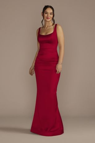 Formal and fun to wear! This silky stretch satin bridesmaid dress hugs the body, with booty ruching and draping that flatters. Horsehair trim gives the trumpet skirt extra flair. Feature power mesh lining for built-in smoothing.