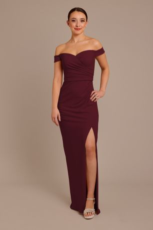 Graceful draping and an off-the-shoulder neckline make this stretch crepe bridesmaid dress a dream to wear.