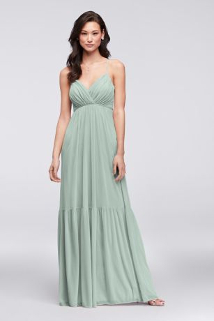 Boho-chic at its finest, this mesh bridesmaid dress is topped with spaghetti straps, a surplice bodice and an empire waist, and finished with a flowy peasant skirt.