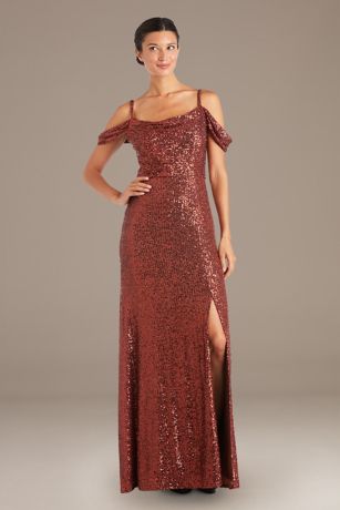 This dress's allover sequins are laid out in a cool, contrasting way: the bodice goes horizontally and the skirt vertically for an extra bit of eye-catching detail. Finished with swag sleeves, spaghetti straps, and a slit skit.