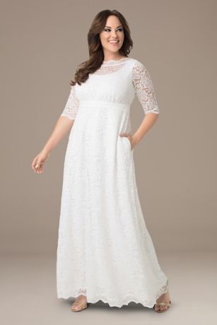 The picture of simple elegance, this plus-size lace wedding gown features a scalloped boat neckline, sheer 3/4 sleeves, and a flattering A-line silhouette. Tuck away tissues or a special keepsake in the side pockets.