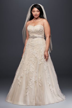 This elegant wedding dress is perfect for a timeless look. Beautiful floral lace appliques bloom atop the strapless sweetheart bodice, as the A-line tulle skirt creates a stunning and flattering silhouette.