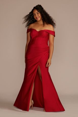 This stretch satin sheath brings Old Hollywood glamour to the new age with an off-the-shoulder sweetheart neckline, sexy corset boning, and a dramatic skirt slit. Pair with your favorite shoes and accessories to create an unforgettable prom moment.