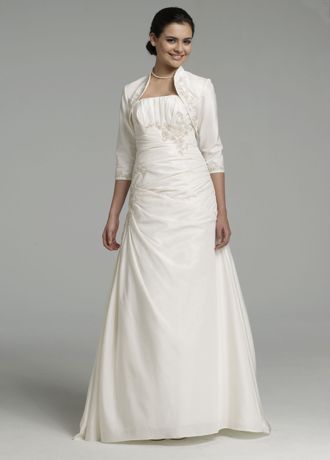 Taffeta draped A-line gown with beaded lace appliques on bodice and skirt.