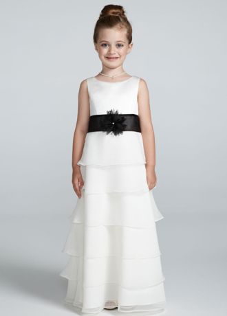 - Organza tank bodice features long tiered chiffon skirt creating a dramatic look.