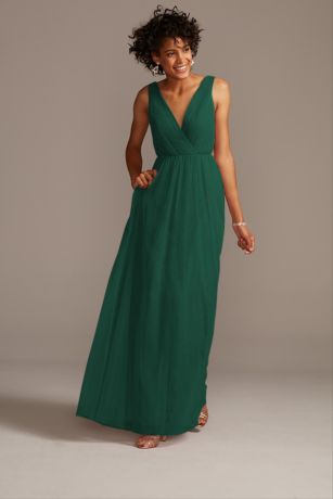 This sweeping net bridesmaid dress features soft, elegant pleats cascading down the plunging-V neckline, creating a romantic, dreamy aesthetic for the bridal party. A faux-wrap bodice and floating layers of soft net add whimsical charm to complete the look.