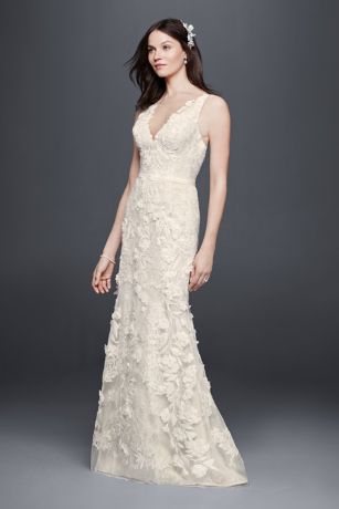 From the illusion tank V-neckline to the chapel train, this sheath wedding dress is filled with spectacular details. Lace and tulle are layered for the most beautiful play of texture, with 3D flowers on top for the final flourish.