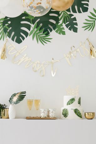 Adorned with metallic tassels, this stylish bunting features the phrase "almost Mrs." in gold script.