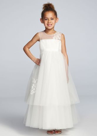Have your flower girl really shine in the stunning floor length illusion tank ball gown with lace embellishments!