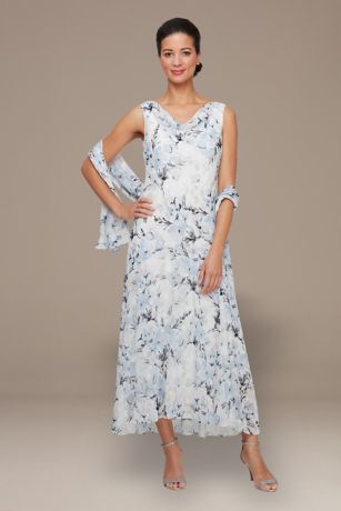 Timeless and graceful, this tea-length floral dress features a soft cowl neckline and a delicate pattern, paired with a matching shawl for added elegance. A perfect choice for the mother of the bride or groom, it exudes charm and sophistication.