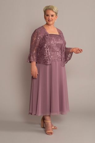 A wonderfully elegant choice for the mother of the bride or groom, this tea-length tank dress features a lace bodice and a chiffon A-line skirt. A matching three-quarter sleeve jacket is perfect for covering up on chilly afternoons or evenings.