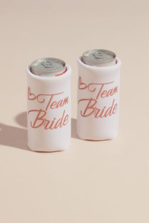 This slim set of four Team Bride neoprene can coolers is the perfect size for your fave spiked seltzer. Featuring rose gold script.