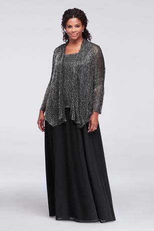 With the look of separates, this textured metallic and chiffon square-neck tank dress is topped perfectly by a shimmery matching jacket.