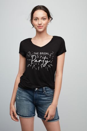 Turn up the music, "the Bridal Party" is here! Wear this super-soft V-neck T-shirt, featuring glittering confetti, to the bachelorette party, after party, or any festive wedding occasion!