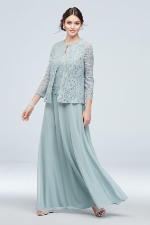 For a look that says classically elegant: a lace cardigan with scalloped opening and matching shell top paired with a flowy layered chiffon maxi skirt.