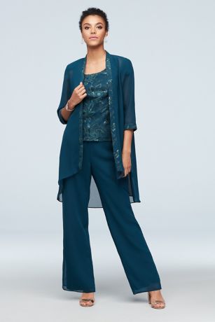 A matching, intricate corded floral knit applique, embedded with flat matte sequins, covers the lapels, cuffs, and shell of this open-front jacket three-piece set. Flowy pants complete the look.