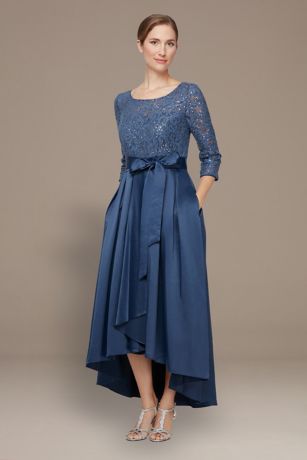 With a sequin lace three-quarter sleeve top and a luxurious satin skirt, this high-low dress is the perfect elegant look for mothers of the bride or groom. A tie belt completes the look.