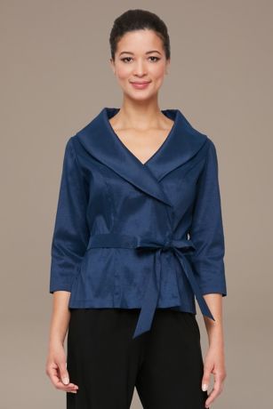 Crafted of light-catching fabric, this blouse gives the illusion of an elegant jacket. Structured with a collar, tie waist, and mini peplum, the only thing missing is your best pair of trousers.
