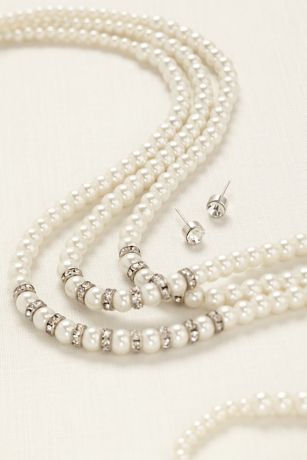 - This beautiful necklace is adorned with three rows of pearls and pave rhinestones, and dazzling pave rhinestone stud earrings complete the set.