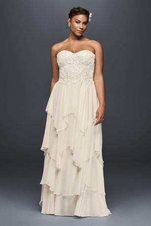 You will float down the aisle in this A-line gown's beautiful layers and layers of weightless chiffon. The strapless sweetheart bodice is crafted of corded lace and sprinkled with sequins.